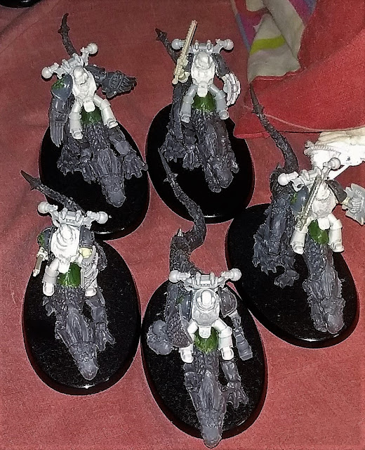 Aquí podéis ver las 2 unidades de 5 jinetes, el "Wolf Lord" y el "Wolf Guard Battle Leader". Ambos personajes llevan Martillo Trueno y Escudo Tormenta de Fire Drake y en las unidades, el Sargento lleva lo mismo pero su escudo es el que llevaban los Dreadnoughts como "estandarte" del que extraí las escamas y hay una miniatura con 2 Cuchillas Relámpago y el resto llevan Escudo Tormenta y Espada Sierra.